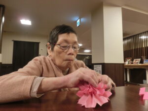 「折り紙は得意なのよ~」「昔はよくこうやって団子を作ったね~」と